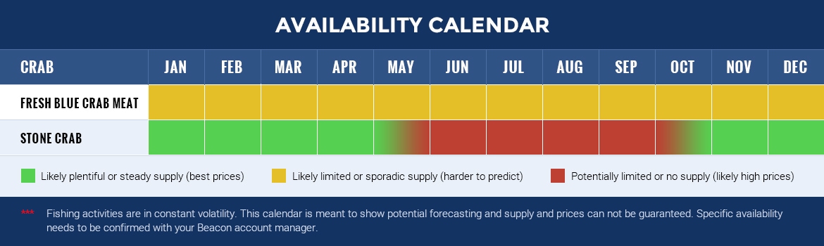 Crabs are decapod crustaceans found in all the world’s oceans and in fresh water in many different sizes, shapes and colors. They are prized for their white flaky meat and succulent flavor. There are many different species but at this time we are only distributing the Blue Crab (Callinectes sapidus) and the Florida Stone Crab (Menippe mercenaria).